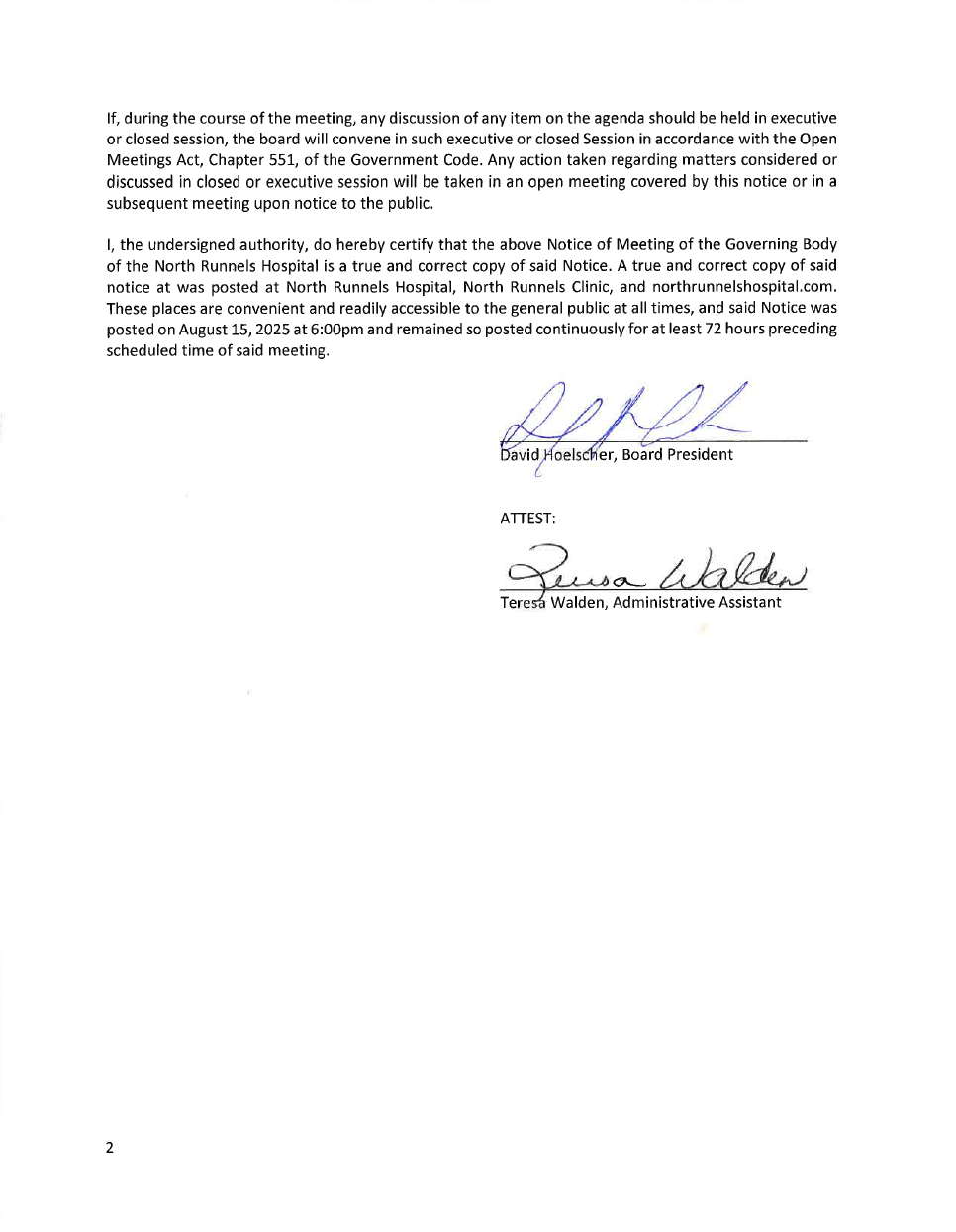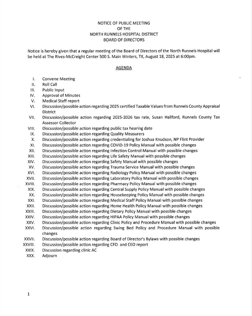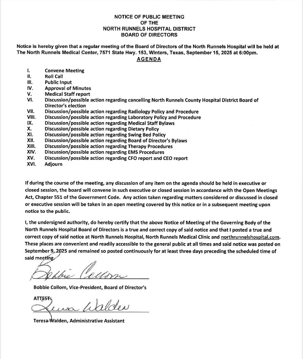 The North Runnels Hospital District Board of Directors will hold a special meeting on November 18, 2024, at 6 PM at the North Runnels Medical Office, located at 7571 State Highway 153, Winters, Texas. The agenda includes key items such as canvassing election results, swearing in board members, discussing employee health insurance rates for 2025, and credentialing new medical staff.